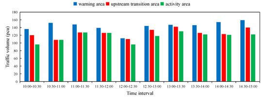Based on the field investigation of traffic flow in the maintenance operation area of Hu-Shan Expressway, this paper analyzes the traffic volume in the warning area, the upstream transition area and the activity area, as shown in Figure 4. According to Figure 4, it can be found that at 13:00–13:30, the traffic volume in the upstream transition area and activity area reaches the maximum; at 14:30–15:00, the traffic volume in the warning area reaches the maximum; at 12:00–12:30, the traffic volume in the warning area, upstream transition area and activity area reaches the minimum. It can be seen from Figure 3 that when the traffic volume in the warning area increases, the traffic volume in the upstream transition area and the operation area decreases. This is mainly because the traffic volume is greater than the road capacity, forming traffic congestion in the upstream transition area, reducing the speed of vehicles. In addition, from 14:00 to 15:00, the traffic volume in the upstream transition area and operation area increases as the traffic volume in the warning area increases. This may be due to the gradual dissipation of traffic congestion, the decrease in traffic density, the increase in vehicle speed, and the increase in vehicles passing through the survey site.