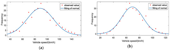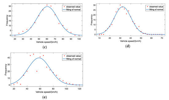 Speed distribution of vehicle speed at five survey locations in the warning area of the expressway maintenance work area (Warning Area 1), the end of the warning area (Warning Area 2), the upstream transition area, the buffer area and the activity area, and specific statistical results are shown in Table 1. Through the statistical analysis of the speed data, it is found that the vehicle speed decreases gradually from the warning area to the buffer area, which is mainly because the vehicles from the upstream transition area to the buffer area need to merge, resulting in the interruption of traffic flow. However, when passing through the activity area, the speed increases gradually. This is because the vehicle has formed a continuous traffic flow in the activity area, and the vehicle has passed the maintenance operation area to restore normal traffic conditions. The normal distribution function is used to fit the vehicle speeds in different regions, as shown in Figure 5. The results show that the speed distribution in different regions follows a normal distribution, and the R values are 0.92, 0.955, 0.978, 0.977 and 0.9017, respectively.