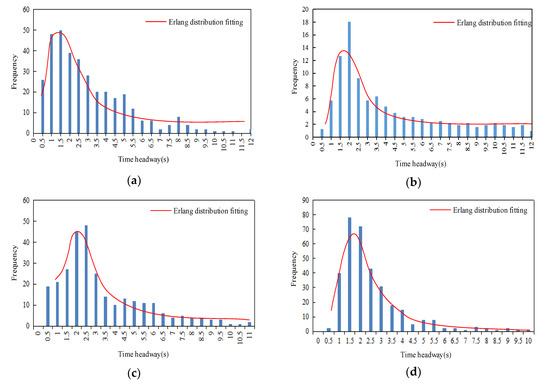 The Erlang distribution function is used to fit the time headway of warning area, upstream transition area, buffer area and activity area, as shown in Figure 6. The results show that the time headway of warning area, upstream transition area, buffer area and activity area all obey the Erlang distribution, where . In addition, K-S test and Chi-square test is used to conduct statistical analysis on the time headway of expressway maintenance operation area. The results are shown in Table 2.