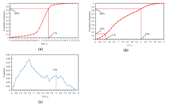 The 85% cumulative frequency curve method is a common method in traffic engineering. According to the velocity distribution generated by the measured cumulative frequency curve, the velocity corresponding to 85% cumulative frequency is selected as the speed limit value. LI Meng et al. [27] used 85% cumulative frequency to determine the threshold of traffic conflicts at intersections and divided traffic conflicts into two levels: serious conflict and non-serious conflict. Therefore, in this paper, traffic conflicts are divided into serious conflicts and non-serious conflicts. According to the time headway distribution of the maintenance operation area, Formula (4) is used to determine the corresponding TTC. In this paper, 85% cumulative frequency is used to divide the severity of traffic conflict. At the same time, the cumulative frequency of 15% is used to verify the effectiveness of the division of traffic conflict severity. If there is a significant difference between the 85% cumulative frequency of serious conflicts and the 15% cumulative frequency of non-serious conflicts, the division of traffic conflicts is unreasonable, otherwise, it is reasonable to divide traffic conflicts into serious and non-serious conflicts. Through statistical analysis of the data, the TTC cumulative frequency distribution is obtained, as shown in Figure 7. In Figure 7, the TTC value corresponding to the 85% cumulative frequency of serious traffic conflicts is 1.3 s, which is consistent with the TTC value corresponding to the 15% cumulative frequency of non-serious traffic conflicts, which indicates that it is reasonable to divide the types of traffic conflicts into serious conflicts and general conflicts. When 0 < TTC < 1.3s, the traffic conflict is serious conflict; when 1.3s < TTC, the traffic conflict is non-serious conflict. The TTC value corresponding to 85% cumulative frequency is 6.0 s, when , the traffic conflict is less observed. Therefore, 6.0 s can be used as the criterion to judge the effectiveness of traffic conflicts, in which, when , no conflict occurs; when 0 < TTC < 1.3s, traffic conflict is serious conflict; when 1.3s < TTC, traffic conflict is non serious conflict; when , it is considered that there is no traffic conflict. Therefore, the threshold value of traffic conflict discrimination in maintenance area is set to 6.0 s.