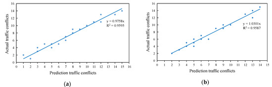 In addition, a linear regression model was used to fit the predicted traffic conflict and the actual traffic conflict in the warning area and the upstream transition area, respectively. The linear fit is shown in Figure 8. The results show that the warning area and upstream transition area are 0.9595 and 0.9587, the predicted traffic conflicts have a significant correlation with the actual traffic conflicts. Ideally, the slope of the best fit line is 1 [31,32]. In Figure 8, the slopes of the warning zone and the upstream transition zone are 0.9758 and 1.0301, respectively, which is very close to the ideal fit line. Therefore, the traffic conflict prediction model can effectively predict the number of traffic conflicts in the expressway maintenance operation area.