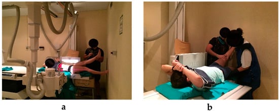 Positioning and traditional (a) and new passive straight leg raise (PSLR) (b) procedure for a lateral radiograph of the lumbar and sacral spine.
