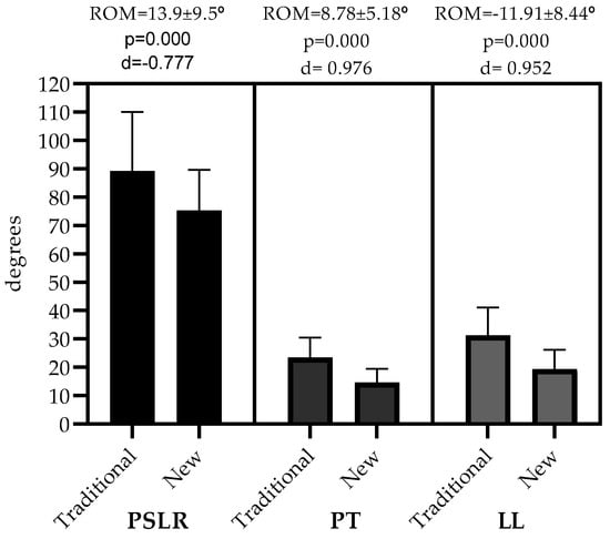 In relation to the lumbar curvature, when we analyze the differences between the radiography in the starting position and the radiography at the end of the test, the reduction of the lumbar lordosis is evident, in both procedures. However, the difference between the angle of the lumbar lordosis in the neutral position and in the final position is lower with the N_PSLR test. Thus, the difference between both angles is 31.3° and 19.4° in the T_PSLR and N_PSLR test respectively. Therefore, there is a significant difference of 11.91° between both procedures (38.7° ± 12.5° vs. 26.8° ± 12.5°; d = −0.952 [moderate]) (Table 2).