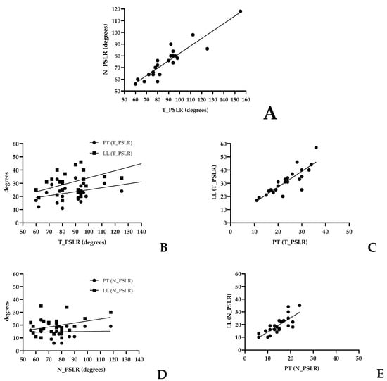 Individual data points and accompanying nonlinear regression lines for both PSLR procedure, traditional and new (A), traditional PSLR procedure and PT and LL (B), PT and LL in PSLR traditional procedure (C), new PSLR procedure and PT and LL (D) and PT and LL in PSLR new procedure (E).