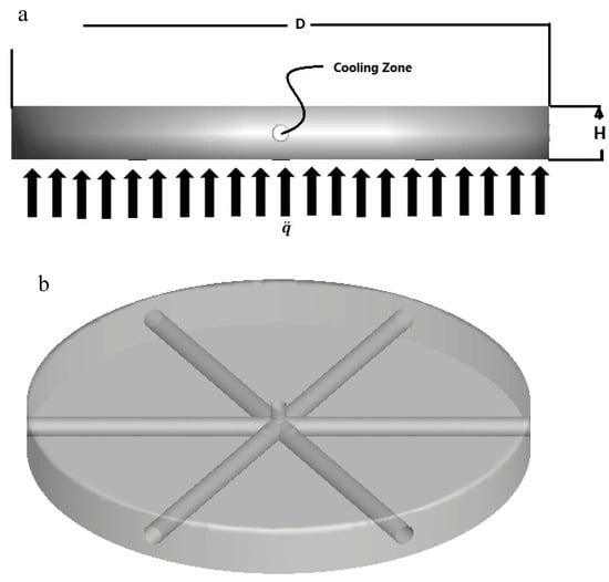 To model electronic cooling equipment, such as processors, a disk with a radius of R, the diameter of D, and the height of H = 0.1 D were considered. The ratio of the cooling zone to the volume of the disk was assumed to be 5% in all cases [,,,]. The radial duct diameter varied with the duct numbers. The outer surface of the disk had been considered stationary, whereas the top and bottom surfaces were considered moving. The disk center was considered as the entrance of the cooling fluid. After uniform heat exchange with the bottom disk, it exited the system through the edge of the disk. Figure 1 shows the schematics of the studied cooling system. In the following microchannel network, the microchannel was extended to all cooling zone in volume (convection method).