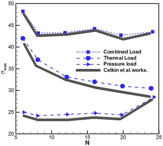 In order to mesh the geometry, an irregular grid was used. The grids were refined near the cooling zone and the interface. The results were analyzed at various mesh numbers to examine maximum velocity, the peak temperature (Tmax, Table 2), and the maximum stress (Table 3) to obtain less than 1% variation. The traditional package of simulation ANSYS CFX and ANSYS STATIC STRUCTURAL software was used for this purpose. For the velocity-pressure coupling, a SIMPLE algorithm was used. Convergence had been acquired with the error magnitudes less than 10−5. The geometry and other conditions in the current study were considered similar to Cetkin et al. []. As could be seen in Figure 2, there was an excellent agreement for thermal stress, mechanical load, and a combination of both loads between present modeling and findings of Cetkin et al. [].