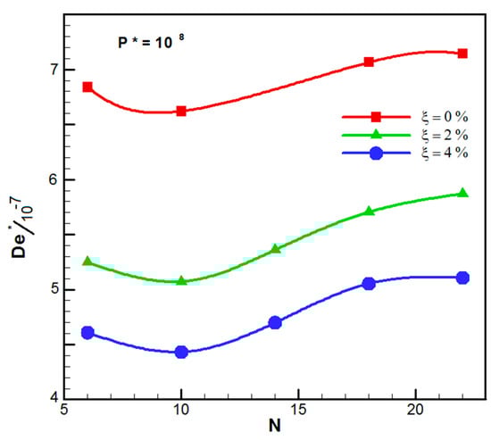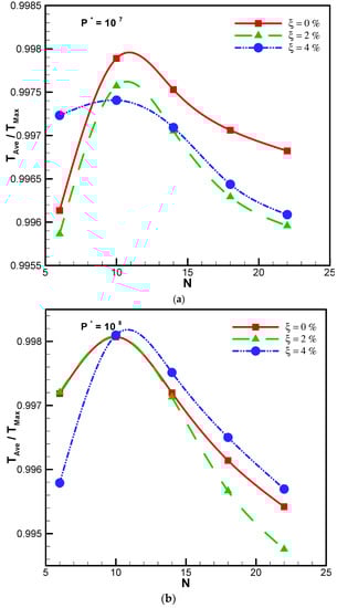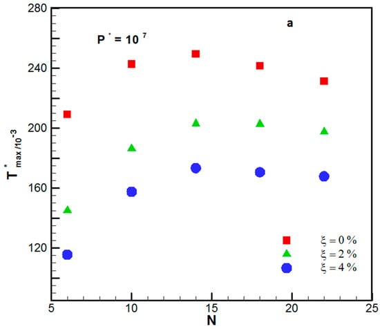 Figure 3a,b represents the maximum dimensionless temperature variations by several ducts for different Figure 3a,b indicates how the peak temperature changed, relative to the volume fraction of nanoparticles and the number of cooling channels, at P*max = 107 and P*max = 108, respectively. For P*max = 108, the peak temperature boosted as N increased when the volume fraction was 0%, 2%, and 4%. However, for P*max = 107, the peak temperature was obtained at N = 14. In both studied P*max, the peak temperature decreased as the volume fraction of nanoparticles increased. For the same N, the difference between maximum temperatures was larger for the range of between 0% and 2% compared to that between 2% and 4%. For the studied cases, by increasing the volume fraction of nanoparticle from 0% to 2%, the peak temperature decreased from 14.5% to 30% (for P*max = 107) and 19.6% to 28.9% (for P*max = 108). Moreover, by nanoparticle volume fraction augmentation from 0% to 4%, the peak temperature decreased from 27.3% to 44% (for P*max = 107) and from 33.2% to 44.7% (for P*max = 108).