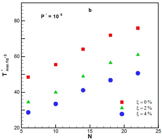 (a) T*max versus N for the different volume fraction of nanoparticles under P* = 107. (b) T*max versus N for the different volume fraction of nanoparticles P* = 108.