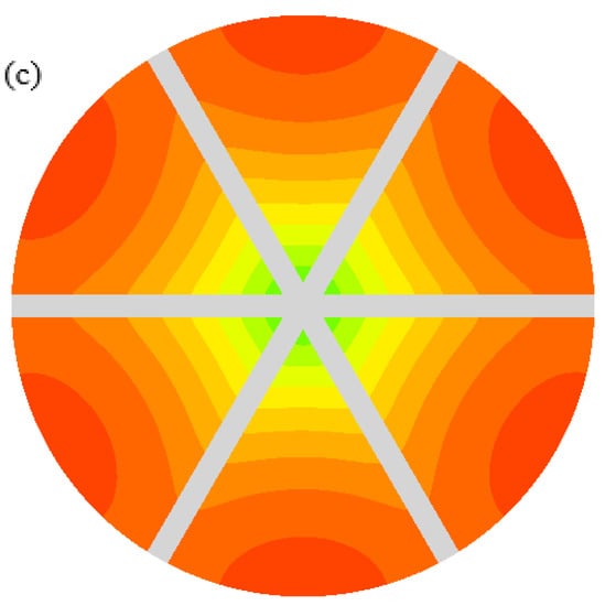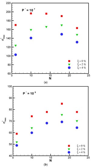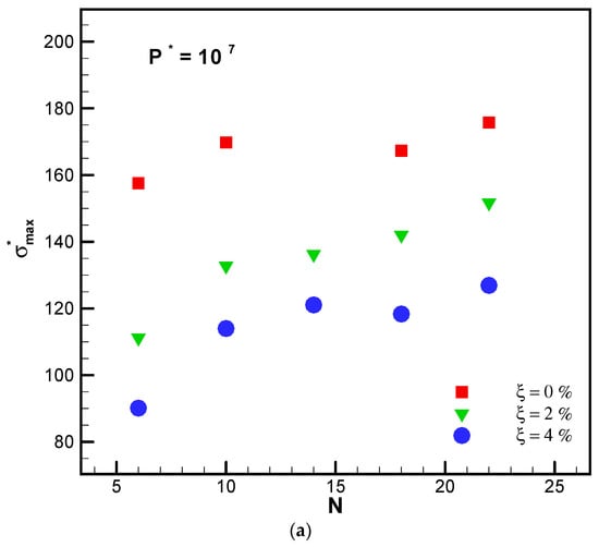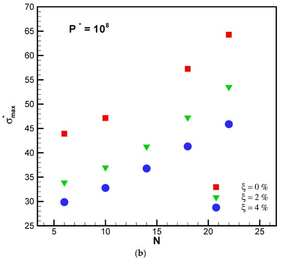 Figure 6a,b depicts the peak stress originated from thermal and mechanical loading (1 × 105 Pa) for various duct numbers. Figure 6a,b shows that the use of nanofluid reduced the peak stress in the segment, and that the peak stress in the disks is decreased when the nanofluid volume fraction is increased. Besides, the greater the N, the greater the peak stress. Increasing the initial pressure diminished the peak stress. The thermal loading caused equal stress at the three orients of the coordinate system. However, the mechanical loading when considering the Poisson coefficient caused stress in opposite directions. Thus, the curve showed a non-linear behavior. When P*max = 107 and P*max = 108, by increasing the volume fraction of nanoparticle from 0% to 2%, the peak stress changed from 9.3% to 27% and 9% to 12.9%, respectively. Moreover, by raising the volume fraction of nanoparticle from 0% to 4%, the peak stress varied from 19% to 39% and 17% to 21%, respectively.