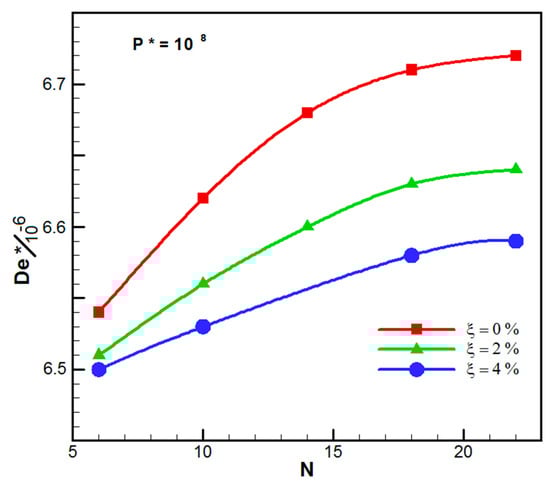 Deformation is described as the change in the metric characteristics of a continuous body, which means that a curve drawn at the initial body placement can change its length when it is displaced to a curve at the total placement []. Figure 7 shows the dimensionless peak total deformation of the disk under the thermal load for different numbers of the duct.