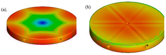 In Figure 9, blue and red colors represent the maximum and minimum values, respectively. As observed in this figure, the maximum thermal strain and temperature of the disk had the same location. In addition, the minimum values are located halfway between the edge of the plate and the center. It is noted that the plate was considered a circle, concentric with the plate center.