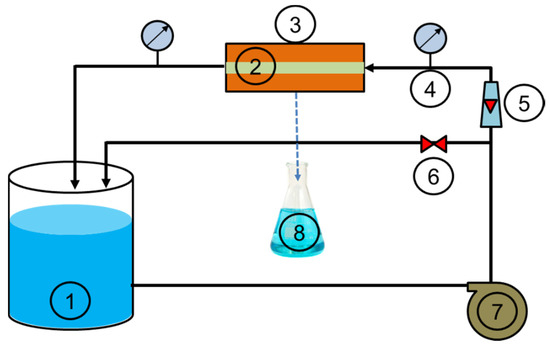 Experimental setup of the tangential filtration system (reservoir (1), tangential membrane (2), module (3), pressure gauge (4), flowmeter (5), valve (6), pump (7), permeate (8)).