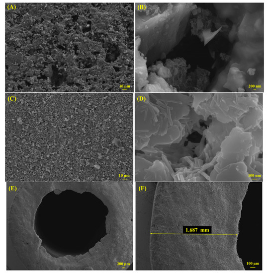 SEM images of the support and ceramic membrane (A,B): the outer surface of the support material; (C,D): the inner surface of the ceramic membrane; (E,F): cross-section of the tubular membrane).