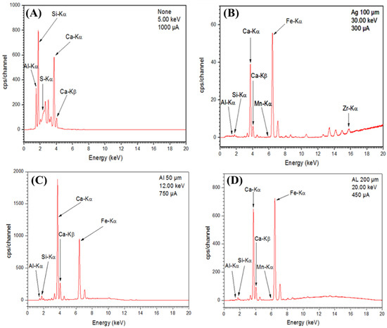 It was also found from the spectrograms of Figure 5C,D, that the clay used in the preparation of the support contained other constituents such as Mn and Fe. We also noticed excitation energy spectra in the range of 3.5 to 4 keV, which confirmed the presence of the calcium (Ca). It composed the calcium oxide (CaO) by addition of calcite (CaCO3) transformed into (CaO) during the heat treatment of the support paste.
