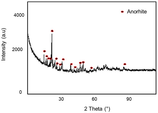 Figure 6 represents XRD reflections of the support at a temperature of 1100 °C for 1 h. The main phase identified in the membrane support was the anorthite (CaO, Al2O3, 2SiO2) which was a predominant phase. This phase was very important because of its promising physical and mechanical properties [5,29].