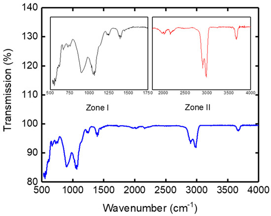 The IR spectrogram of the clay support represented by Figure 7 was divided into two main zones. The first peaks corresponded to high frequency bands (wave numbers) between 3700 and 2800 cm−1, and the second peaks corresponded to the lower frequencies located in the 1500–500 cm−1 area. The high frequency bands (zone II) concerned the vibration of OH hydroxyls, while the low frequency bands (zone I) related to the Si-O, Si-O-Si, Al-OH-Al, Al-OH, and Al-O bond networks [32].