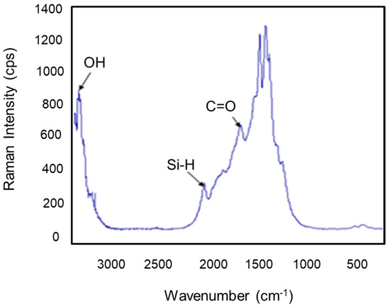 Figure 8 represents the Raman spectrum of the clay support, where several bands were observed. We noticed the appearance of new spectra at 1694, 2080, and 3372 cm−1, which express the vibrations of ν (C=O), Si-H, and OH, respectively [36].