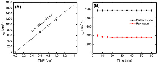 Figure 9A shows that the permeate flux (Jp) of distilled water increases with the increase in the transmembrane pressure (TMP) according to the Darcy law [37]. The variations of the permeate flux (Jp) versus time using distilled and raw drinking water are presented in Figure 9B. According to the obtained results, it can be seen that the permeate flux for the distilled and the raw water were not of the same order. This behavior can be explained by the retention of certain matters by the ceramic membrane causing a blockage of the pores, which leads to the reduction of the amount of water passing through the membrane (permeate). The straight line for distilled water explains that the flow of water was constant over the filtration time. On the other hand, the permeate flux of raw drinking water decreased during the first 20 min and then became constant. It could be explained by there being a certain amount of suspended matter which had deposited on the surface of the membrane.