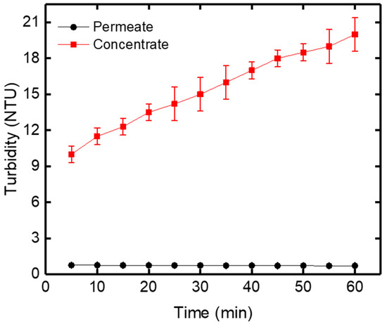 Turbidity variation of the permeate and concentrate versus filtration time at TMP = 0.8 bar.