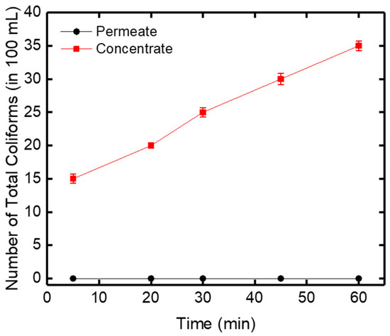 Biological tests of total coliform bacteria were also performed in this work to test the retention capacity of the ceramic membrane. E. coli are considered as indicators of the microbial quality of drinking water [38]. In the filtered water (permeate), the number of coliforms was equal to zero during 60 min filtration, which depicted that all of the total coliforms were rejected by the zirconia-based ceramic membrane (Figure 11). On the other hand, in the concentrated water, an increase in the number of total coliforms from 15 to 35 in 100 mL was obtained after 60 min of filtration.