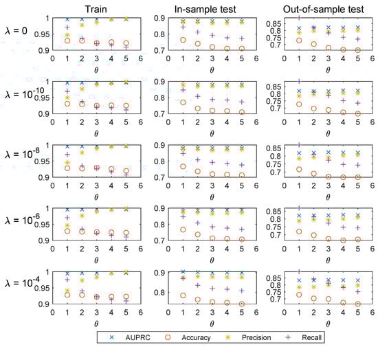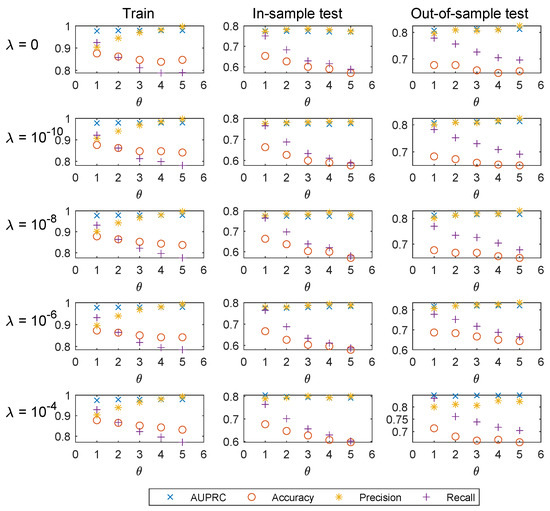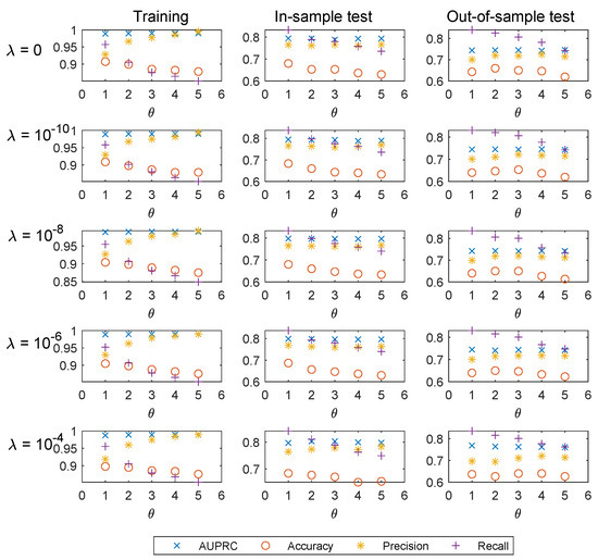 Since the number of features taken into consideration is considerable, overfitting may happen under the standard logistic regression. Regularization could help to reduce the chance of, or the amount of, overfitting. As shown in Table 4, we present the AUPRC results of training, in-sample test, and out-of-sample test for 2013, 2014, and 2015. For a fixed , a higher regularization parameter in general yields higher out-of-sample AUPRC.