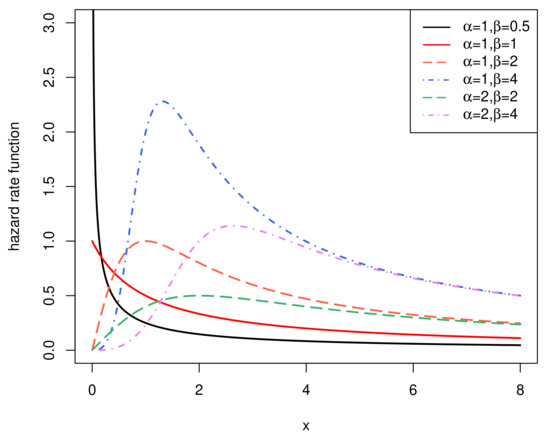 We assume for calculating the variance of the log-logistic distribution. As we can see from Figure 1, log-logistic distributions have a non-monotonic hazard function. It will decrease monotonically if and will become a unimodal function if . Therefore, the hazard function we will study is unimodal.