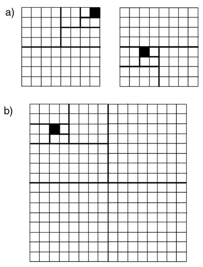 As shown in Figure 1a, the number of binary decisions halving the field does not depend on the location of the “submarine”, or in the case of multiple submarines, on their spatial relationship. In both cases, the uncertainty is the same—six questions. As the size of the space increases, so does the uncertainty. In panel b it can be seen that locating the submarine requires eight binary decisions (log2n, where n is the number of cells).
