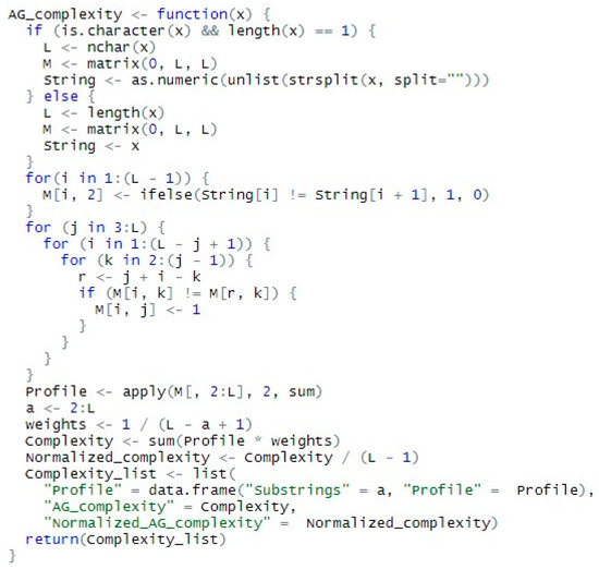 The function showcased in this paper calculates complexities of binary strings of any length. The input, argument , can be numeric, a character vector or a string of zeros and ones. Input x can be imported from data files in most popular formats including txt, .xlsx and .csv or typed directly in R. Its output is a list that consists of the profile and its corresponding substrings, its unnormalized and normalized complexities, as well as the mean AG profile , where S is the surface under the profile computed using Simpson’s rule. More details about Simpson’s rule integration can be found in [35]. Mean profile is useful in the comparison of the complexities of long strings. To access the executable code, please go to the archive “AG program” in the supplementary materials (If you wish to use the software presented here, please cite this paper).