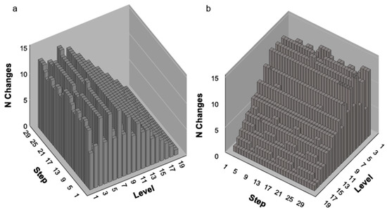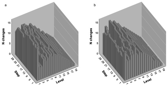 The output string contains three full periods of length 16 (plus two extra symbols). As can be seen from Figure 3, the periodicity is registered in two ways. First, levels 2, 4, 6, 8, 10, and 12 have noticeably less change than their odd neighbors (Figure 3a). These inter-level oscillations are invisible in the direction of scanning. In other words, if focusing on low-level structure, we cannot detect any loci of low complexity. The evidence of order lies in the strict inter-level periodicity. Before we describe Figure 3b, we should note that the characteristic shape of the profile relief map—a “ridge”, which reaches a maximum (a peak) at level 5, followed by a slope—is a consequence of a trade-off between the number of windows per scan and their size. Figure 3b shows that the slope running towards level 19 is steep, this being due to the periodic “erosions” or drops in complexity at levels 14, 16 and 18. These intra-level oscillations can be viewed as the higher structural “harmonics” of the underlying period.