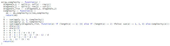 It should be noted that complexity increases linearly with image resolution whereas computation time increases exponentially. A 100 × 100 matrix takes about 6 seconds, whereas a 400 × 400 matrix requires approximately 24 min. This is not surprising considering the depth of analysis but restricts the practical use of the current implementation of 2D AG roughly to 200 × 200-cell matrices (about 90 s). However, an optimization which automatically assigns the value of zero to arrays of zeros or ones can speed up computation for matrices that contain a large number of such arrays. For example, for a display containing two small triangles (see next section), a 300 × 300 matrix can be computed in 90 s. Figure 6 gives the R code with the optimization option. We are currently examining different ways of expediting the computation of larger arrays.