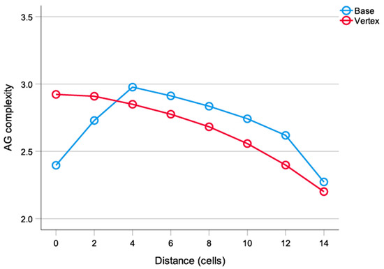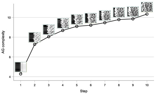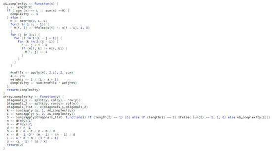 Complexity profiles are computed as follows: let M be a matrix whose columns are binary arrays of changes (0 = no change, 1 = change) in each substring. Then, profiles for each substring are computed as sums of matrix columns. AG complexity is computed as the sum of complexity profile entries, each of which is weighted by . The AG algorithm [33] was originally implemented by Keith Gibson in Java language. The package includes a large number of tools including the computation of different change-based complexity measures for different alphabet sizes and a 2D interface, which computes complexities of rectangular arrays of size up to 24 × 24. The package is available on request from the first author. However, appreciating that many researchers might want to experiment with the algorithm, we decided to provide a translation of the original algorithm in R, which is a widely used environment for programming in many scientific fields.
