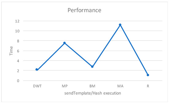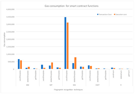 The sendTemplate/Hash, deleteTemplate/Hash, getTemplate/Hash function incurred transaction and execution costs, as illustrated in Figure 6. The execution time taken to send a template or hash by to the Ethereum network also varies. Figure 7 displays how our proposed system has high performance, because it just sends the hash to Ethereum when compared to that of the other templates from the different recognition techniques.