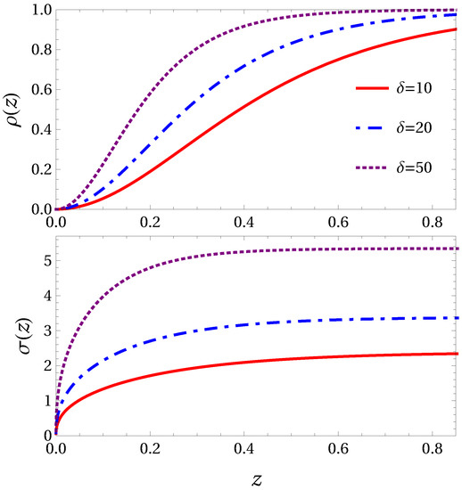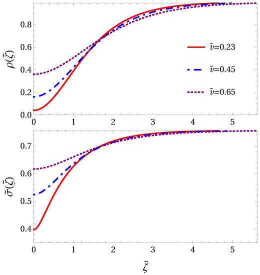 Plots of the numerical integration of Equation (61) are shown in Figure 2, for three values of . Accordingly with those integrations, is also computed and shown in the plot.
