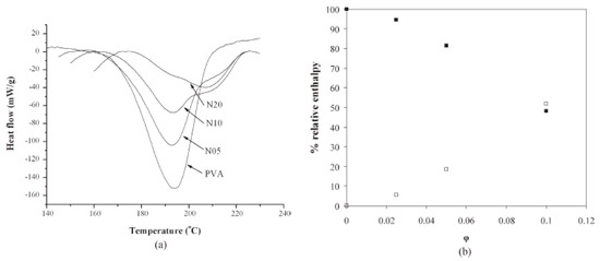 (a) Differential scanning callorimetry curves in the melting region. (b) Fraction of the heats of fusion for the two phases (closed symbols: bulklike phase, open symbols: clay induced phase). Reproduced by permission from [33]. Copyright 2011 Wiley Periodicals, Inc.