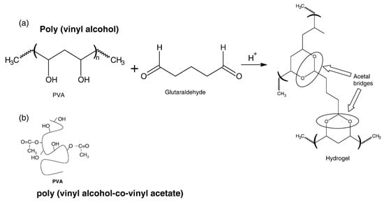 Crosslinking reaction between (a) poly (vinyl alcohol) and (b) glutaraldehyde. Reproduced with permission from [53]. Copyright 2007 Elsevier B.V.