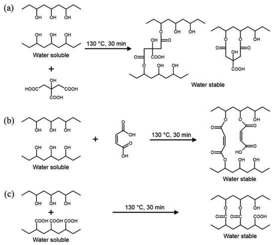 Cross-linking reactions between (a) citric acid, (b) maleic acid and (c) poly (acrylic acid) and PVA. Reproduced with permission from [54]. Copyright 2017 WILEY-VCH Verlag GmbH & Co.