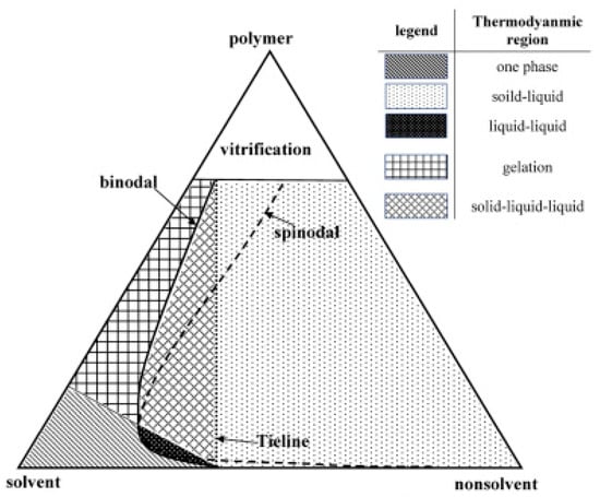 Non solvent induced phase separation (NIPS), also referred to as immersion precipitation, in which the addition of a non-solvent in the polymer solution results in a miscibility gap, according to the ternary diagram of the system as shown in Figure 6 [87]. NIPS is the primary technique for the production of asymmetric structures and polymeric membranes on an industrial scale, resulting in pore size diameters ranging from hundreds of nanometers to 10+ μm. Typically, the polymeric solution is casted in the appropriate support (e.g., a non-woven fabric [88]) and is afterward dipped in a non-solvent bath, resulting in the immediate solid membrane formation.