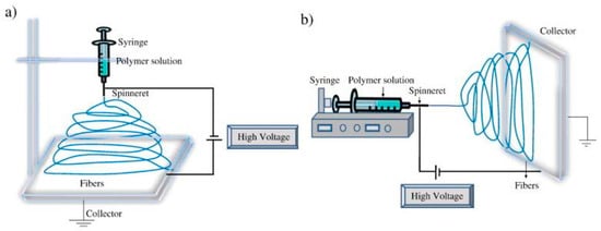 Schematic diagram of setup of electrospinning apparatus. (a) Typical vertical setup and (b) horizontal setup of electrospinning apparatus. Reproduced with permission from [94]. Copyright 2010 Elsevier Inc.