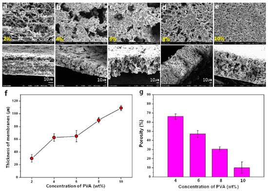 Surface and cross-sectional scanning electron microscopy (SEM) images of the matrix as a function of the PVA solution concentration: (a) 2, (b) 4, (c) 6, (d) 8, and (e) 10% PVA solutions. (f) The thickness of the matrix as a function of the PVA solution concentration. (g) Graph showing the porosity as a function of the PVA solution concentration. Reproduced with permission from [64]. Copyright 2014 ACS publications.