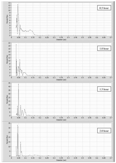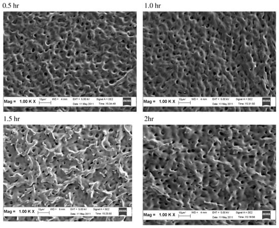 Ahmad et al. [105] prepared PVA (88% hydrolyzed, 88,000 Mw) asymmetric membranes using deionized water as the solvent and a mixture of sodium hydroxide (4.0 wt%) and sodium sulfate (8.0 wt%) as a coagulant in similar way with previous studies [106]. The prepared membrane was then crosslinked using glutaraldehyde (10 g/L), sodium sulfate (45 g/L), and sulfuric acid (5 g/L) for 0.5, 1.0, 1.5, and 2 h of reaction time. Although not clear from the electron microscopy observation, by increasing the crosslinking reaction time, the pore size distribution became narrower while the average pore size was also reduced, as depicted in Figure 10 and Figure 11. The membranes were evaluated for their pure water flux with the results indicating that there is no clear relationship between pore size and water permeability, rather, a relationship between the hydrophilicity and the water flux.