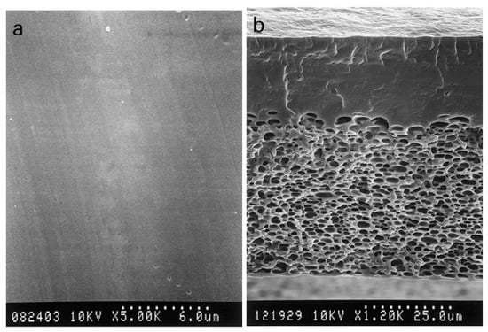 SEM images of a PVA membrane: (a) top layer and (b) cross-section. Reproduced with permission from [108]. Copyright 2000 Elsevier Science Ltd.