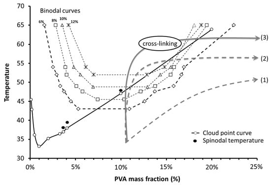 In a study by M’Barki et al. [110], porous membranes were prepared by temperature induced phase serration with a PVA of 72% DH selected due to its low cloud point temperature (Tcp, 47 °C for 10 wt% polymer). The membrane microstructure resulted from phase separation mechanisms occurring by spinodal decomposition. Authors studied the binary PVA/water phase diagram (Figure 13) as well as the crosslinking kinetics in order to determine the desired conditions for membrane preparation.