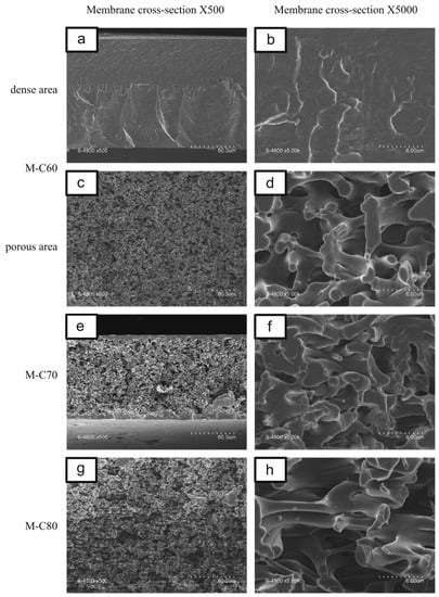 Chuang et al. [108] prepared asymmetric PVA (Mw 74,800) membranes (Figure 12) and studied the effect of including dextran (Mw 12,000) and poly (vinyl pyrrolidone) (Mw 10,000) in the membrane casting solution. Membranes were prepared using water as the solvent, and Na2SO4/KOH/H2O as the coagulant medium Findings indicate that when PVP was introduced in the solution, compact structures were favored, while the addition of dextran induced the pore formation on the membrane’s top layer.