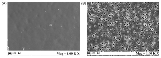 PVA membrane surface obtained at P = 200 bar, T = 45 °C and 10% (w/w), with an ethanol: CO2 ratio of 40:60, w/w (A) and 60:40, w/w (B). Reproduced with permission from [115]. Copyright 2008 Elsevier.