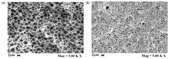 Effect of polymer concentration on the PVA membrane section at P = 250 bar, T = 55 °C and with an ethanol: CO2 ratio of 60:40, w/w, (A) 10% (w/w) and (B) 20% (w/w). Reproduced with permission from [115]. Copyright 2008 Elsevier.