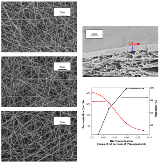 (Left) SEM images of electrospun PVA membranes with various molecular weights but similar degrees of hydrolysis: (A) 98% hydrolyzed, Mw 13,000–23,000 g/mol (electrospun from 24 wt% solution); (B) 98% hydrolyzed, Mw 78,000 g/mol (from 11 wt% solution); and (C) 98–99% hydrolyzed, Mw 85,000–124,000 g/mol (from 9 wt% solution). (Upper right) Typical SEM cross-sectional image of PVA nanofibrous composite membrane. (Lower right) Relations of permeate flux and solute rejection of the nanofibrous composite membranes with the degree of crosslinking in the PVA hydrogel coating for separation of oil/water emulsion (feed pressure: 100 psi; temperature: 30–35 °C). Reproduced with permission from [119]. Copyright 2006 Elsevier.