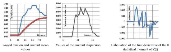 Thus, the first statistical moment shows the direction of the interaction process for the sensor with the studied substance; the second statistical moment defines the dynamics of the interaction process. Calculation results of the initial statistical moments for the measured tension are given in Figure 4.