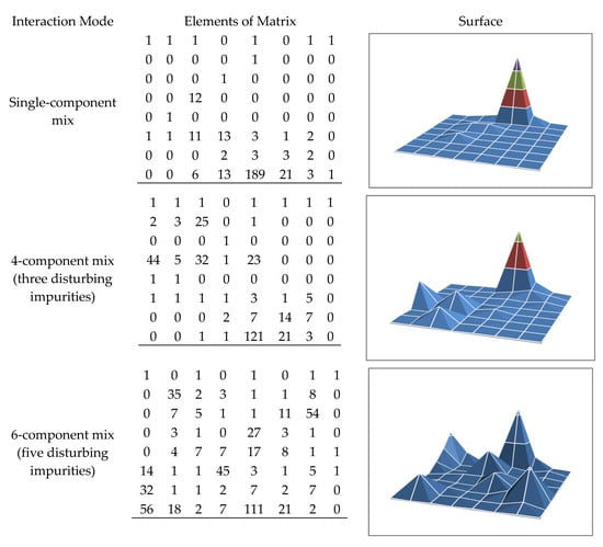 where is the transformed signal at measurements of a multicomponent mixture, is the transformed signal received from the component blending by ; there are components of an identification vector of substance k. Since the quantity of the equations is defined by the number of analytical channels, the quantity at the same time found for substances for multicomponent mixtures is limited. In a matrix form, Equation (8) can be written down as , where .
