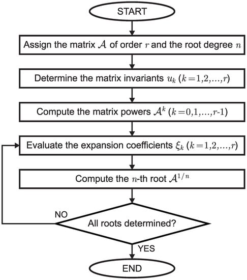 Based on Theorem 3, the proposed algorithm for the evaluation of the roots of a matrix can be described through the flowchart illustrated in Figure 1. It is straightforward to verify that the computational complexity of the relevant numerical procedure is in the worst case.