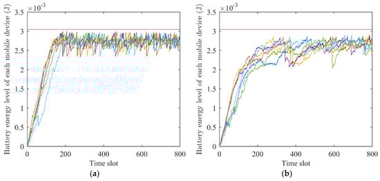 As shown in Figure 2, Lyapunov stability optimization can ensure that the power level of the local mobile device is maintained in a stable state. On the one hand, the task can be offloaded based on the battery power. On the other hand, the mobile device can locally have enough power to keep other applications running. In the experiment, the power of the mobile device is initially zero. As the energy is continuously collected and combined with the energy consumption of the task processing, the power will eventually remain in a stable state. Because the OILP algorithm considers the task priority, it will prioritize high-priority tasks at the beginning, and take energy supplement as a secondary consideration, which will lead to a longer time for the battery energy to reach stability, as shown in Figure 2a, when the number of the local device , the number of the MEC server , and the penalty value for the unprocessed tasks . The power of the local mobile devices that use the system and algorithm of this paper tend to be stable at about the 200th time slot. However, when we set the penalty value for the unprocessed tasks , as shown in Figure 2b, the power of the local mobile devices tends to be stable at about the 600th time slot, and is less stable than what is shown in Figure 2a. This is because a high penalty value ignores the local battery energy level, resulting in system energy instability. Therefore, in this paper, the penalty value for ordinary tasks that cannot be processed is the time slot interval , while for the tasks with priority, the consumption of unprocessed tasks is redefined in Equation (36), so as to ensure that the tasks with priority are processed.